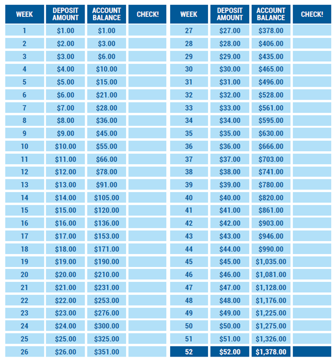 We all have seen the 52 week money challenge, but have you ever tried it. Some people say I will start at the beginning of the new year. Or I will wait to start on such and such date. It is a 52 week challenge it can be started at anytime. Here is my spin on the challenge, yes, I save every week, but I saw what I can on the list for that week, and I check it off. Say if its week 14, and instead of saving $14 for that week I may have a little extra that week so I will save $49. The total amount may not be a lot, but what could you do with an extra $1378. To complete this challenge shows discipline. We all have to start somewhere